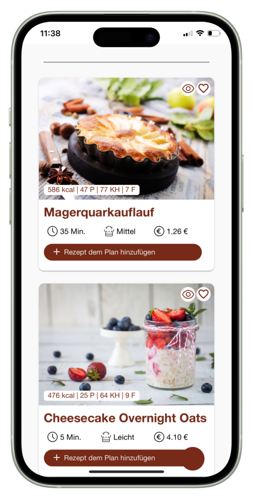 Ein personalisierter Ernährungsplan, der auf Basis der Anamnese individuell auf deine Ziele und Bedürfnisse abgestimmt ist. Du isst vegetarisch, vegan oder magst bestimmte Lebensmittel nicht? Kein Problem, innerhalb der Planung ist alles variabel. In der App hast du außerdem jederzeit Zugriff auf deine Ernährungsplanung.